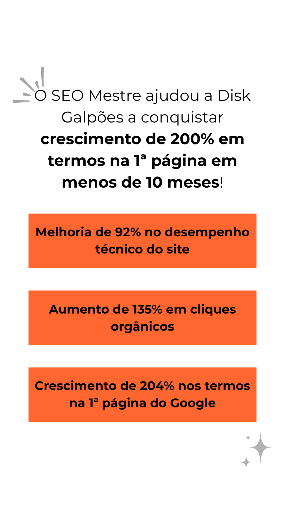O Mestre SEO já gera resultados para diversas empresas, como a Disk Galpões que aumentou em 135% os cliques no orgânico e um crescimento de 204% nos termos na 1ª página do Google.