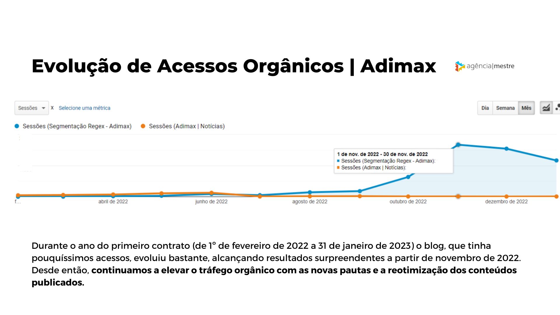 Iniciamos a produção e a implementação de conteúdos no blog de Adimax em abril de 2022 e, durante os meses, observamos a evolução orgânica que os novos conteúdos foram gerando.