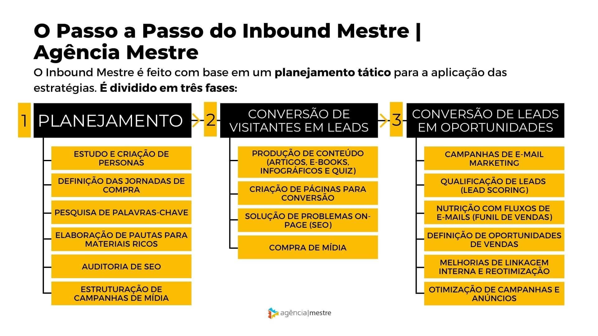 Basicamente, nossa metodologia do Inbound Mestre funciona em três etapas: Planejamento, Transformação de visitantes em leads e Transformação de leads em possíveis clientes.