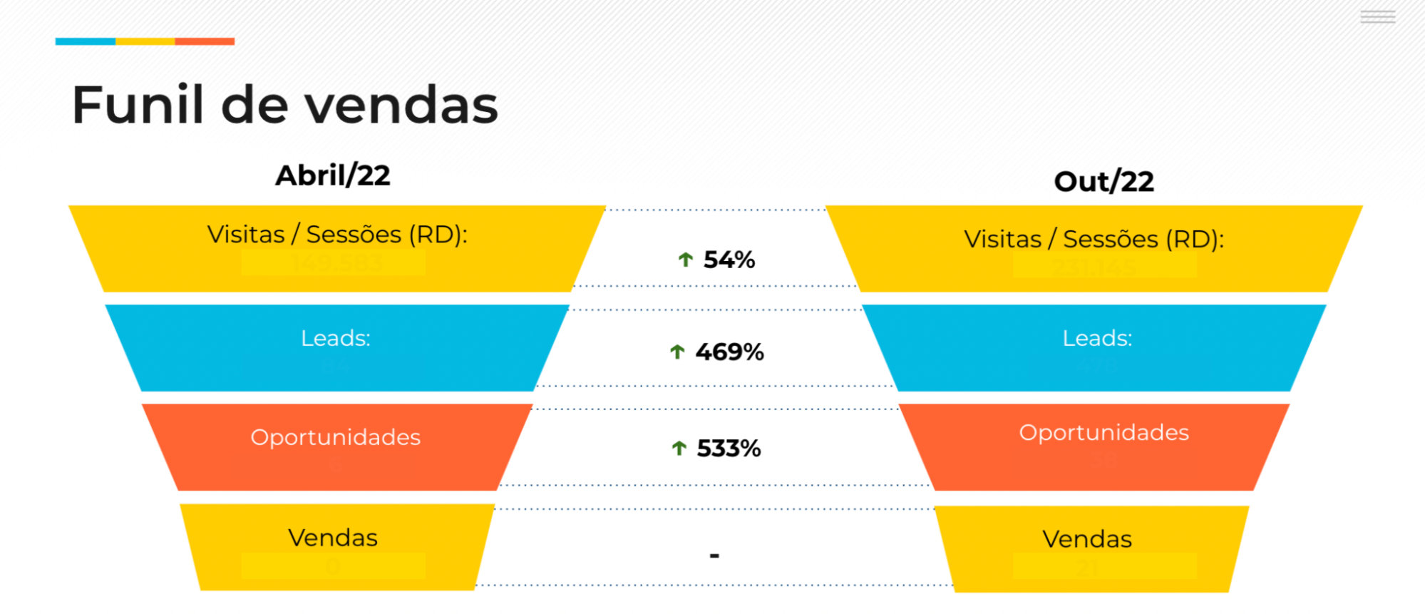 Os resultados do projeto da Univates começaram a aparecer logo após 4 meses de projeto, que teve início em fevereiro de 2022. E quando comparamos abril e outubro, o terceiro e nono mês de projeto, o crescimento é surpreendente quando consideramos apenas as ações de inbound para leads, oportunidades e vendas!