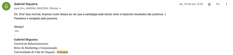 Mas, nossa equipe não parou por aí, criamos um fluxo de reforço para os contatos com maior pontuação, de maneira que pudéssemos acelerar o momento que eles estivessem prontos para receber o contato do time comercial da Univates. Exploramos todas as oportunidades que tínhamos em mãos para gerar mais resultados!