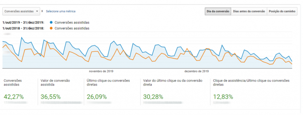 Além dos resultados diretos atribuídos ao nosso trabalho, conquistamos também um crescimento no número de conversões assistidas. Isto significa que o canal orgânico conseguiu contribuir em alguma etapa da jornada do consumidor até a conversão em outros canais.