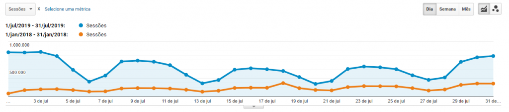 No início do projeto, em janeiro de 2018, contávamos com o total de 782.651 palavras-chave posicionadas. Hoje, no início do segundo semestre de 2019 — já depois de uma renovação para mais um ano de projeto — temos o total de 1.581.464 palavras-chave posicionadas, o que significa um aumento de 102%!