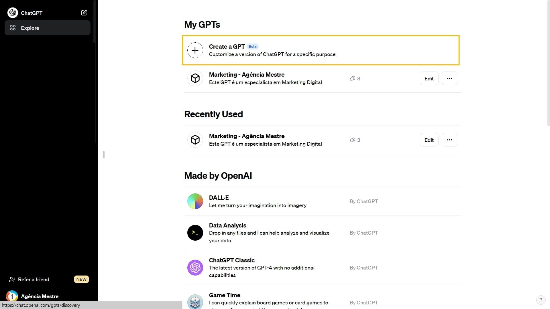 A criação de um novo GPT pode ser feita “tão facilmente quanto uma conversa”, segundo a startup. Para começar, o usuário precisa estar logado em uma conta ChatGPT Plus ou Enterprise e selecionar a opção “Explore”: