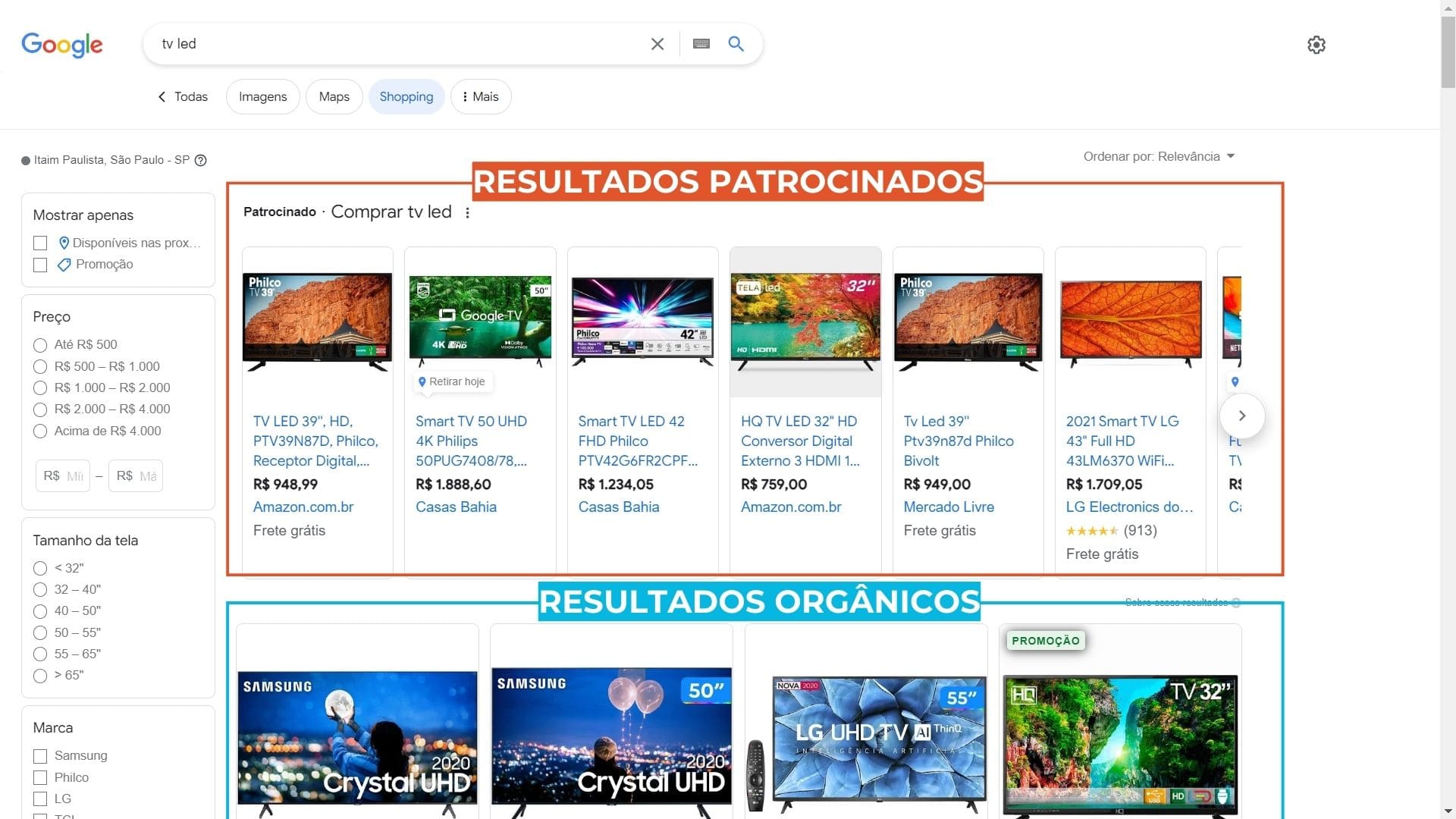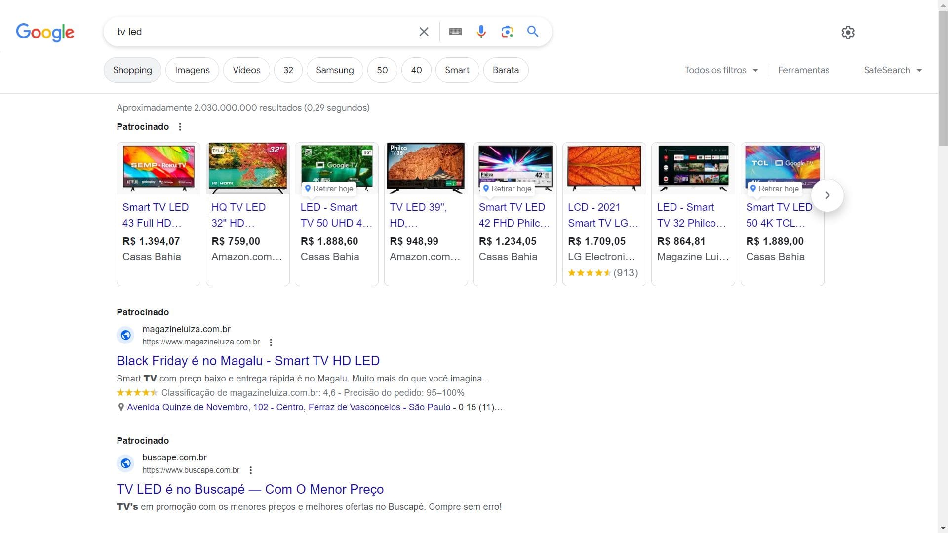 Para acessar ou “ativar” o Google Shopping basta digitar algum produto na barra de busca, por exemplo, o termo “tv led”:
