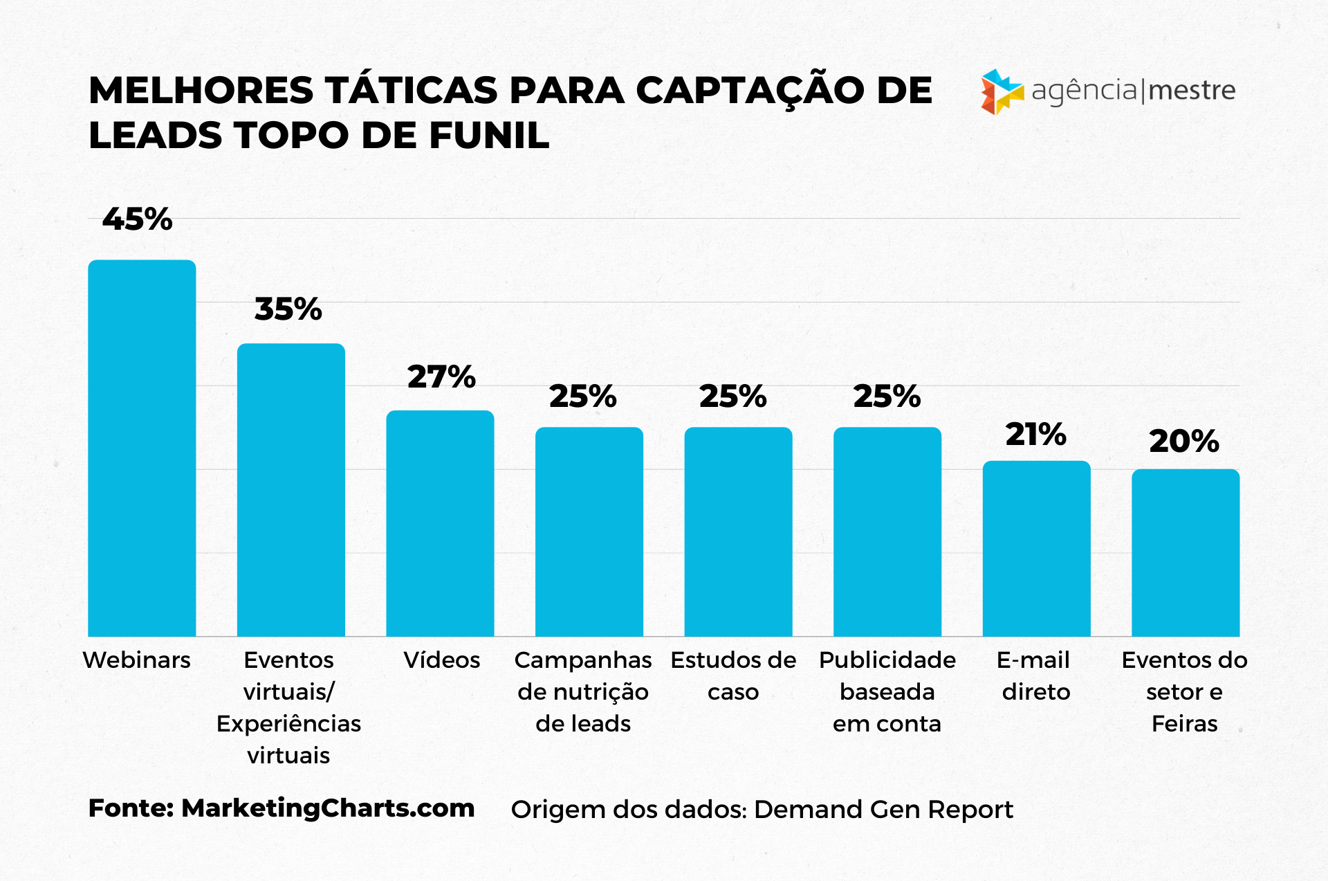 Segundo o Demand Gen Report e o ON24, os webinars de marketing B2B são uma das táticas mais bem-sucedidas na geração de leads no topo do funil. Ou seja, leads que ainda estão descobrindo e aprendendo sobre seu produto ou serviço