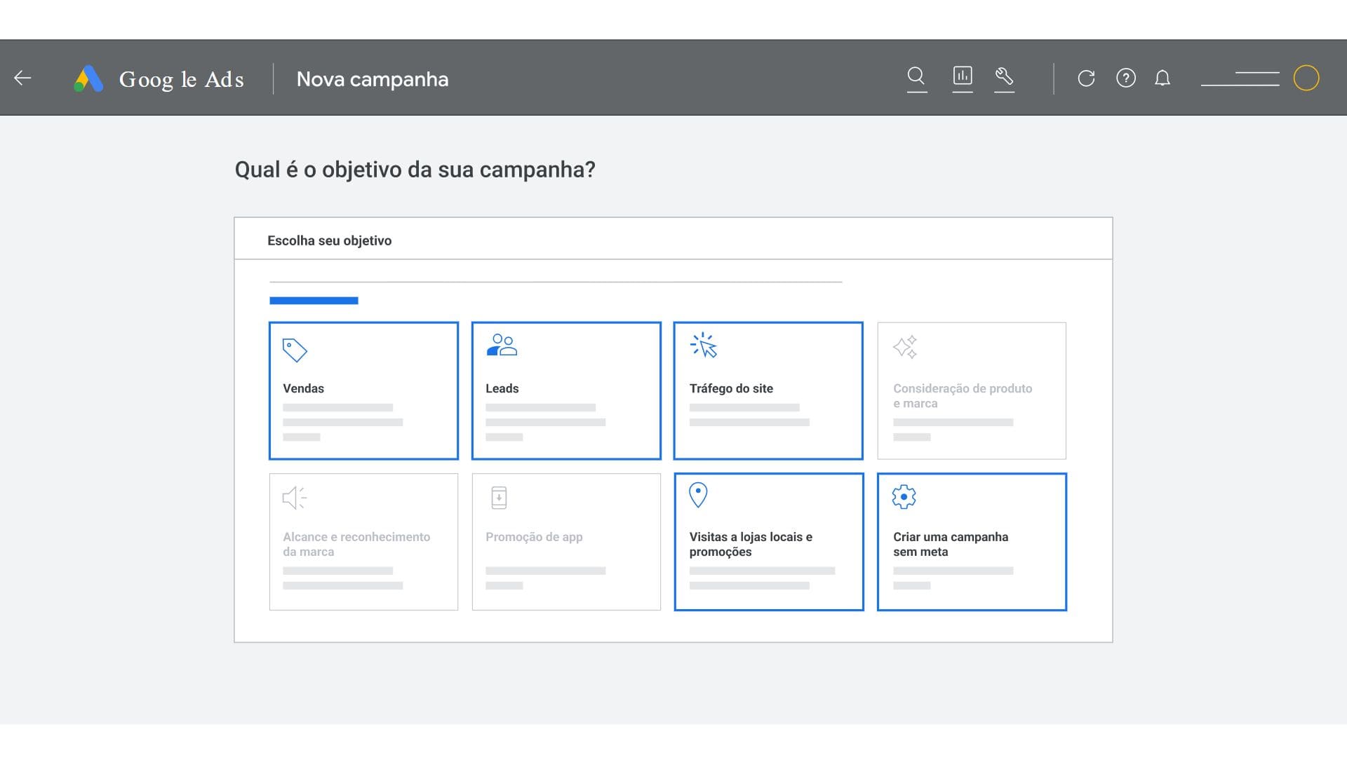 Ao fazer login na sua conta do Google Ads, selecione a seção Campanhas no menu à esquerda e clique no botão de adição para começar uma nova campanha. Selecione um objetivo de publicidade para sua campanha e, caso nenhuma das metas esteja alinhada com seu propósito, prossiga com: “Criar uma campanha sem meta”.
