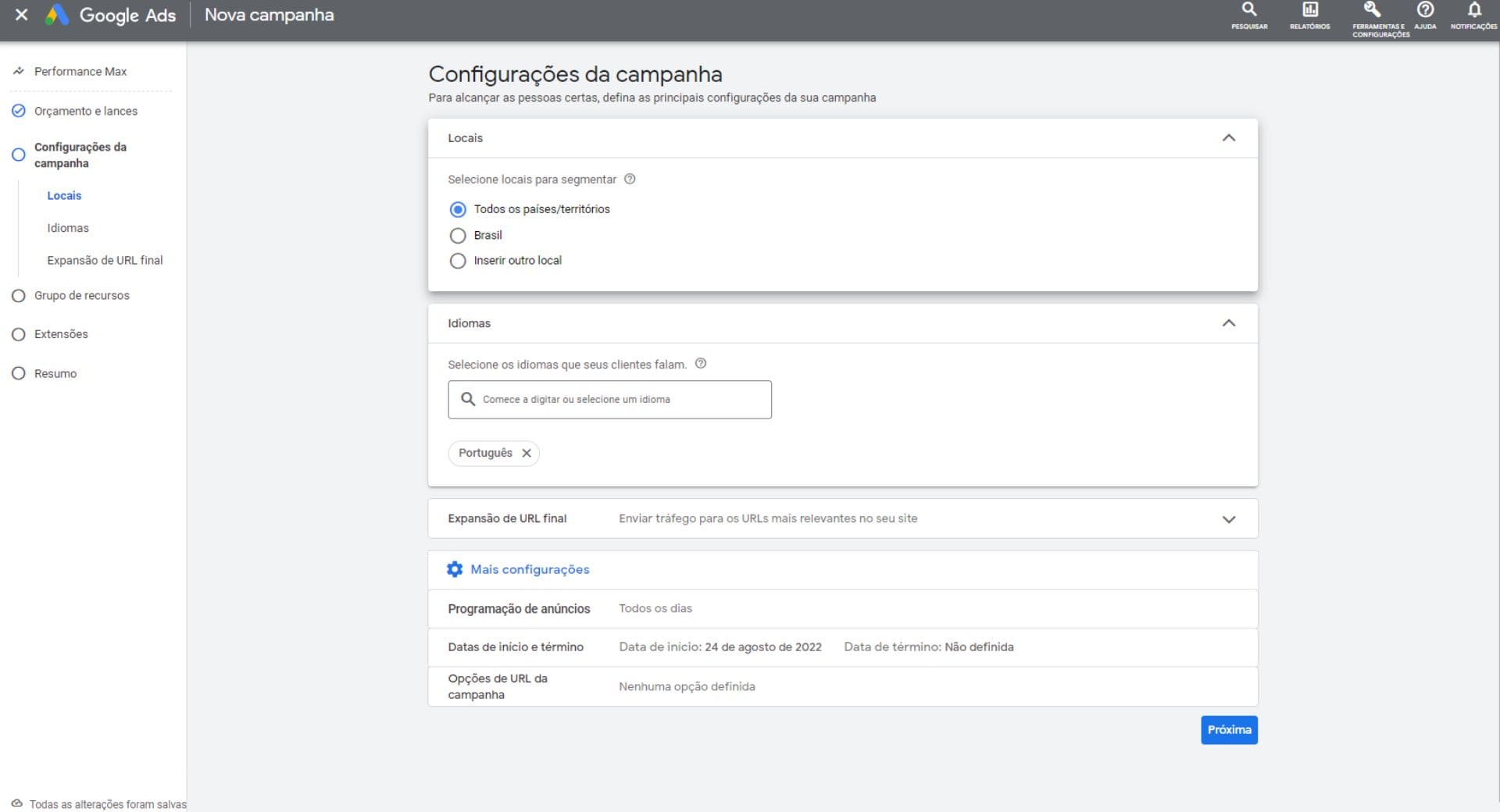 Após definir o orçamento e os lances, a próxima etapa consiste em configurar os locais e idiomas no qual a campanha deverá ser veiculada.