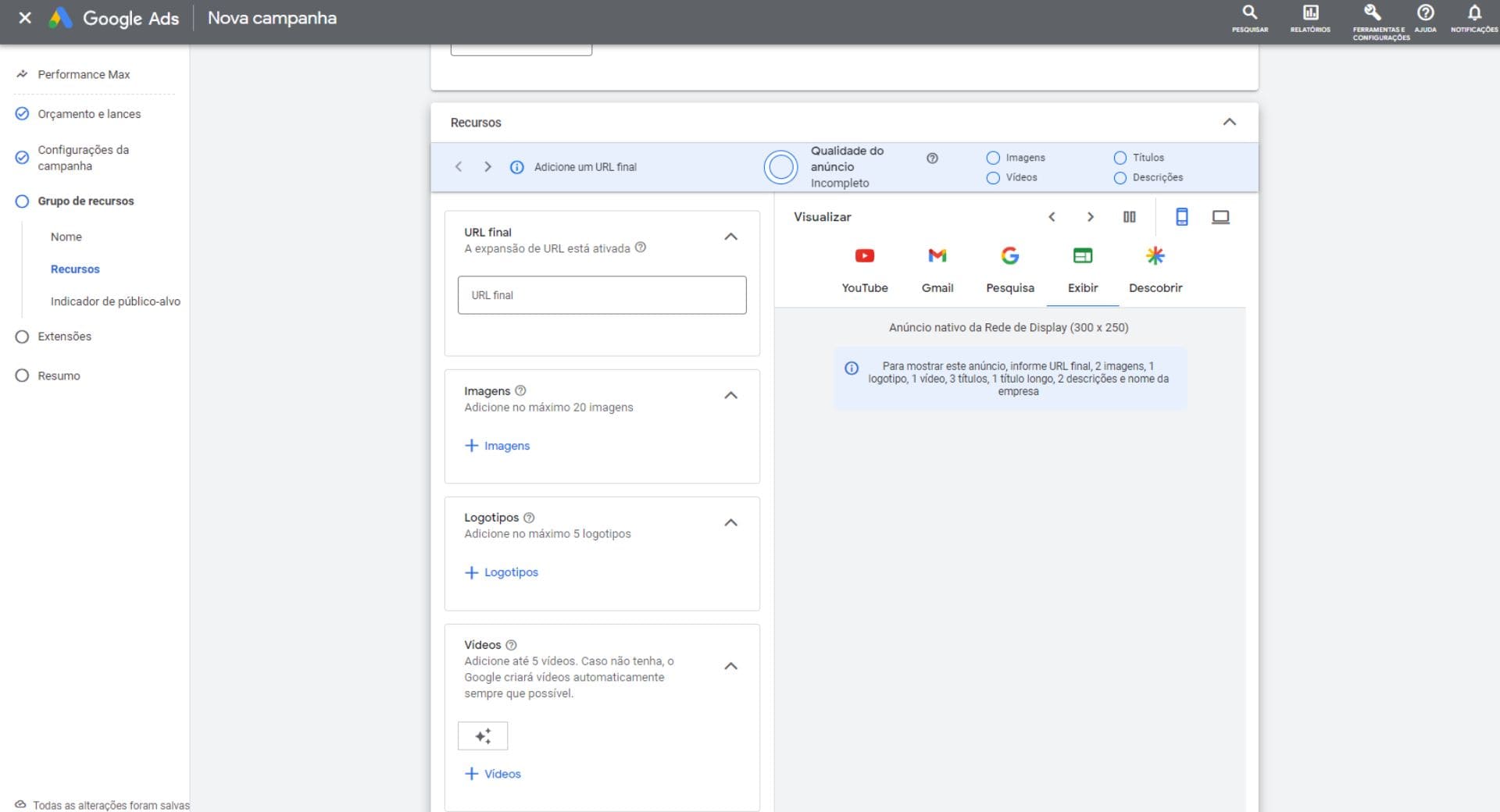 As campanhas Performance Max trabalham com automação focada em selecionar, dentro do conjunto de anúncios, a melhor copy e o melhor criativo para convencer o usuário a clicar, com base no machine learning. Por isso, na página: “Grupo de recursos”, você deverá inserir: