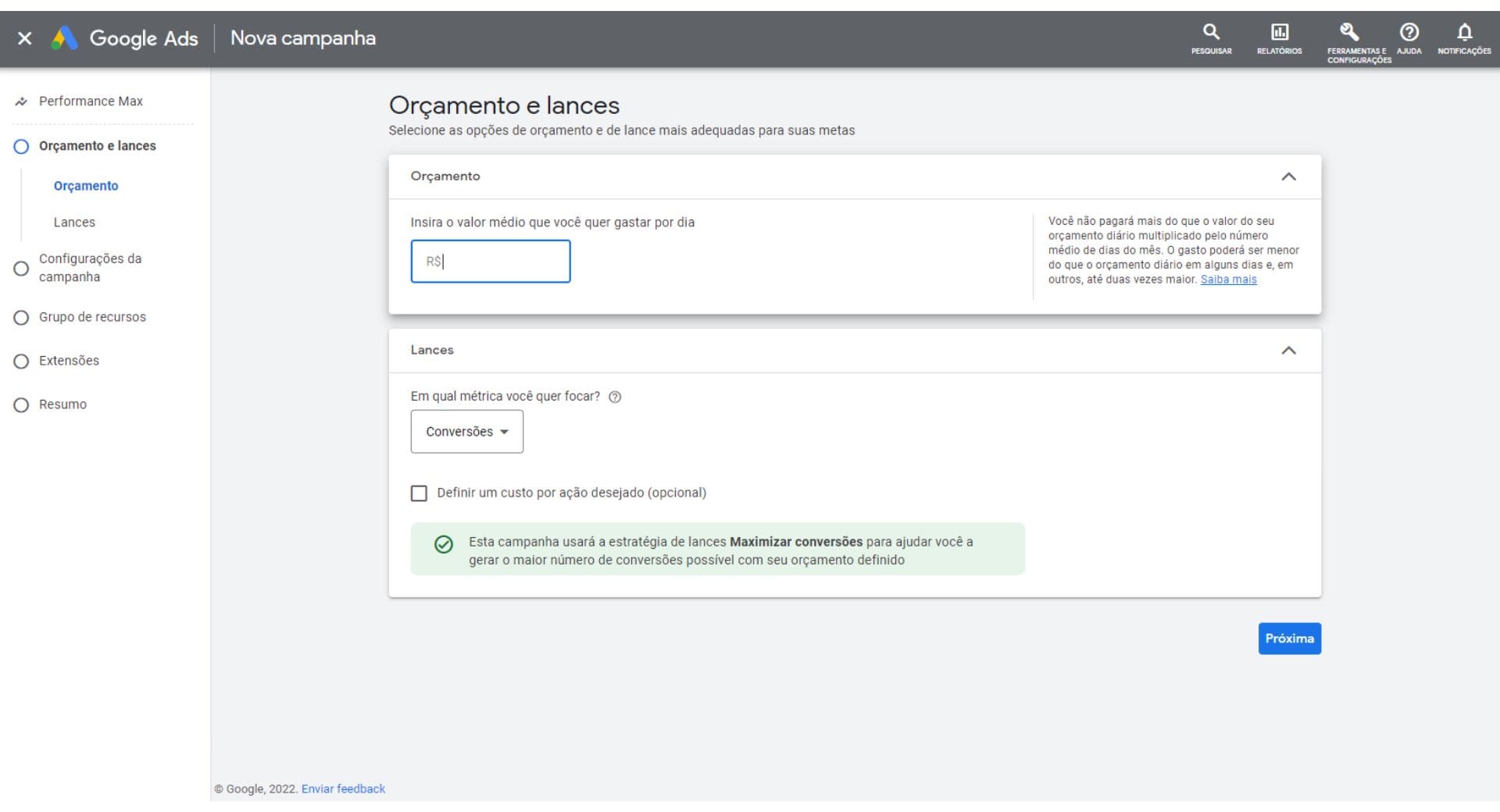Dependendo da sua estratégia, é recomendado que você comece a maximizar suas conversões para que o PMax possa começar a coletar os dados e criar um histórico sólido, para que você analise e crie as metas desejadas de acordo com essas informações.