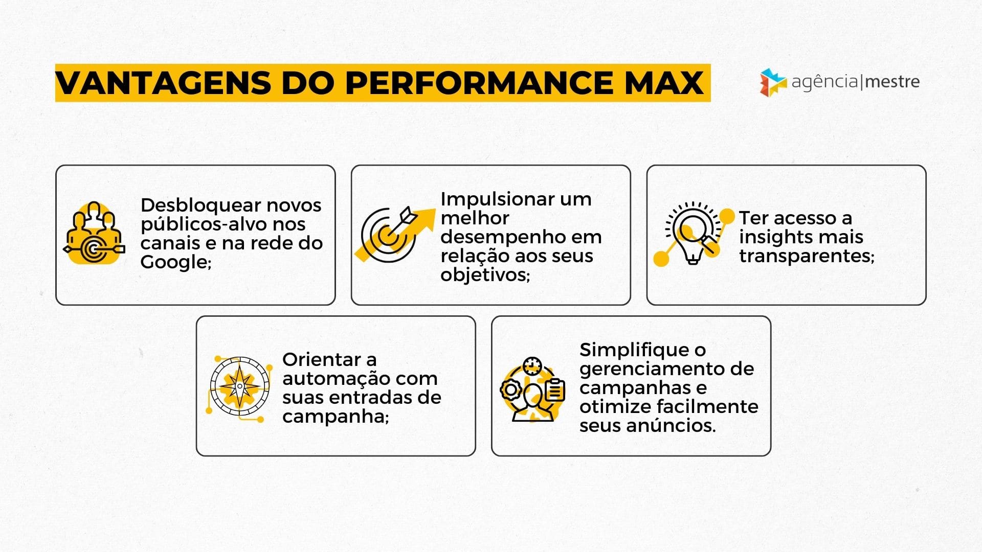 O recurso gera conversão em todos os canais do Google, impulsionando a performance para atingir as metas de conversão. Além disso, o Performance Max utiliza IA do Google para automatizar lances, realizar otimização de orçamento e público-alvo.