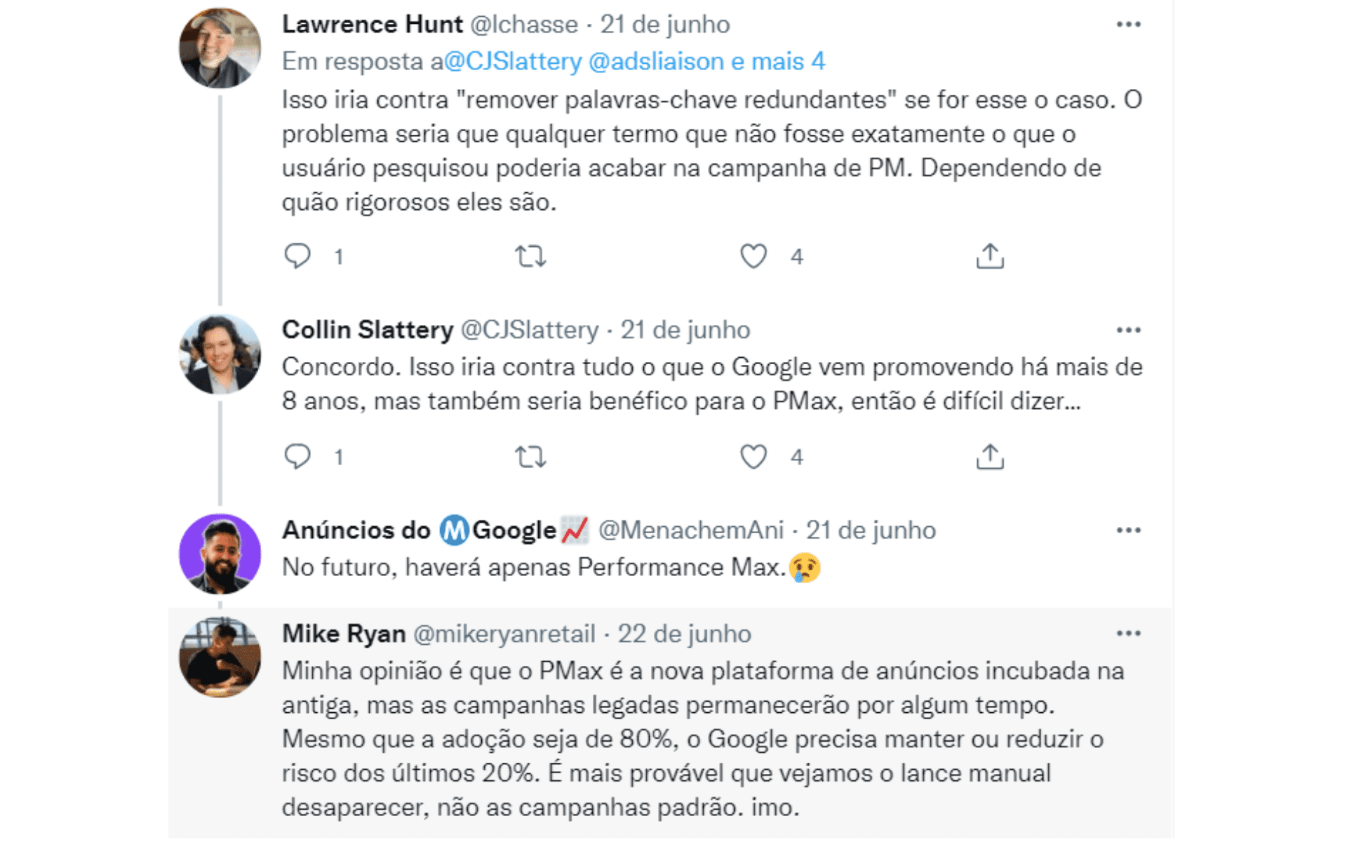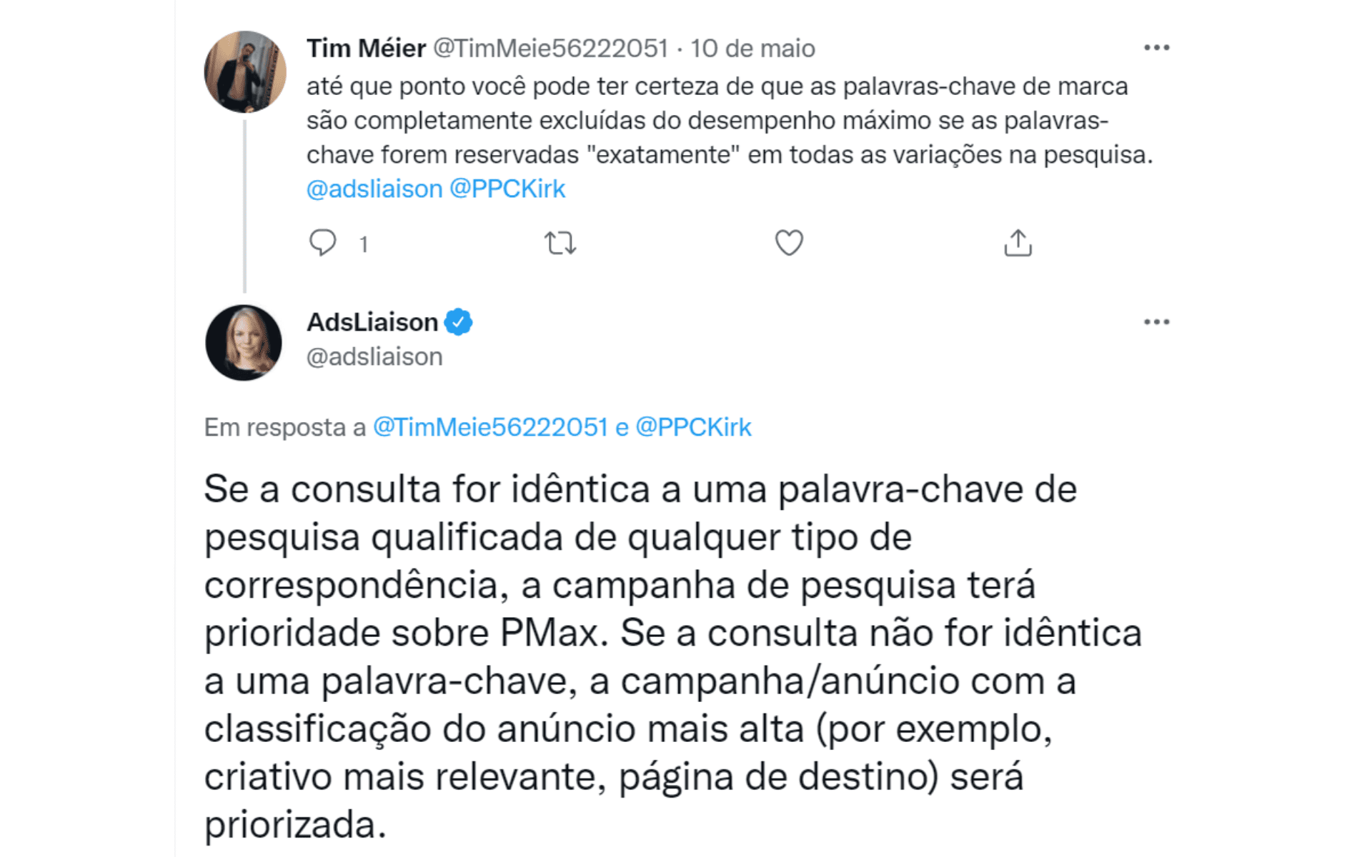 A utilização de “palavras-chaves idênticas”, citadas no tweet, é uma das formas listadas pelos especialistas para impedir que o volume de campanhas de marca caia frente à utilização de campanhas do tipo PMax, um dos questionamentos levantados por outro usuário no Twitter.