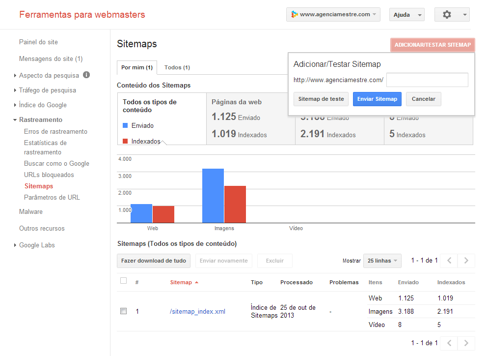 Em seguida, você precisa enviar o seu Sitemap de Notícias através do Google Webmaster Tools. Para isto, acesse o seu painel e localize a área de Sitemaps.