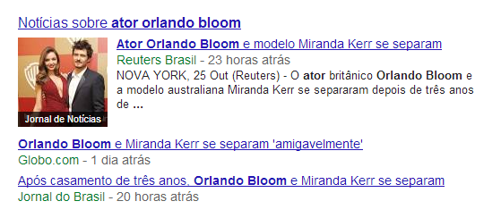 A parte boa é que o Google News se integra aos resultados de busca quando o termo pesquisado é relacionado com alguma matéria recente. Quando isto ocorre, os usuários visualizam na parte superior do Google uma caixa intitulada “Notícias sobre…” :