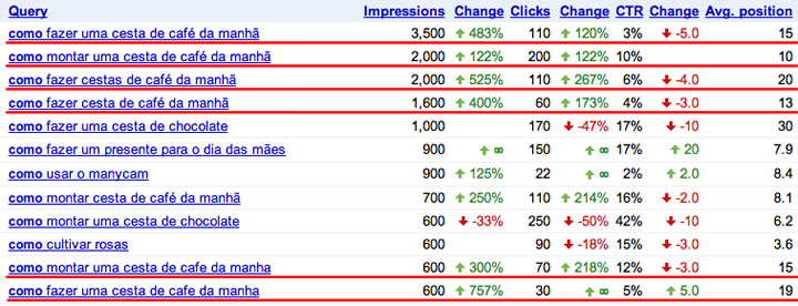 Note que assinalei seis queries – essas buscas se relacionam a um assunto já tratado no site em um determinado conjunto de páginas. Nesse caso, é necessário verificar o que pode ser melhorado no conjunto de páginas que abordam esse tema, para que uma delas passe a figurar entre as 3 ou 5 primeiras posições, e não entre as 20 primeiras. Talvez o conteúdo da melhor página ainda não seja interessante ou, ainda, pode ser que reforçar a linkagem interna entre as páginas que abordam o assunto ajude a página principal a obter melhores resultados.