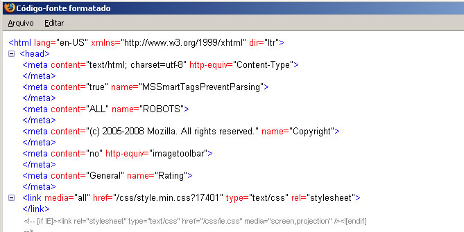 View Formatted Source – Exibe o código fonte destacando os tipos de estruturas e o bloco de css relacionado ao código.