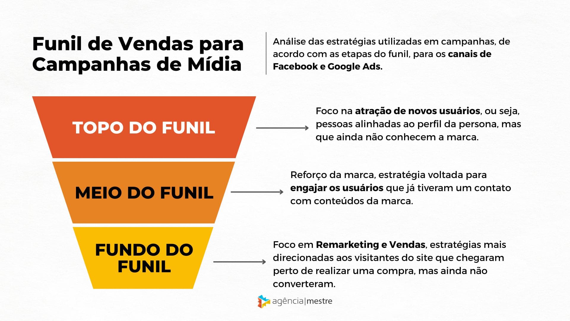 Identificamos que os melhores canais para atuação das estratégias de Mídia seriam o Google e Facebook Ads. Pensando em obter o melhor resultado em cada campanha, dividimos a estratégia de acordo com as fases do funil: