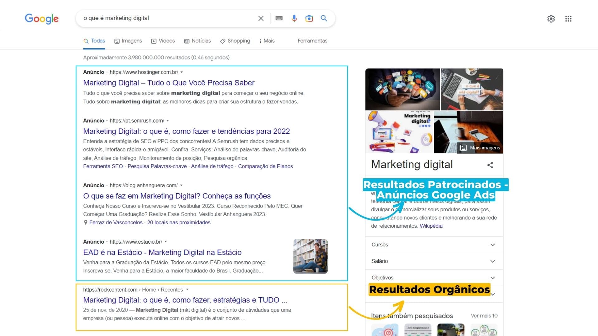 Toda vez que alguém faz uma pesquisa no Google, dois tipos de resultados aparecem: os orgânicos e os pagos (também conhecidos como links patrocinados). Os que estão relacionados ao Google Ads são os pagos.