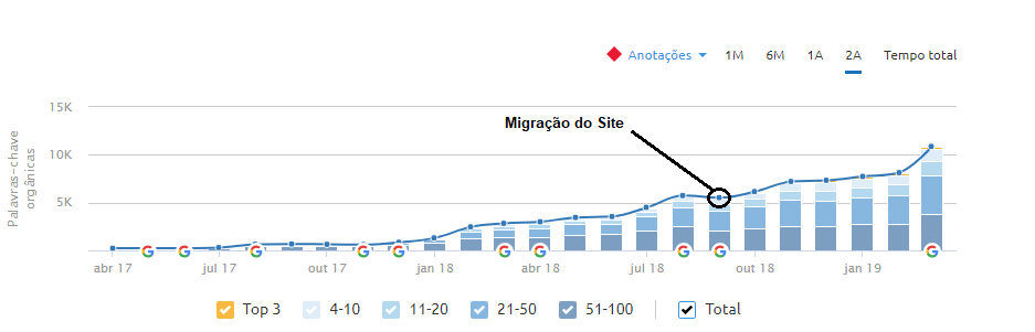 No início, o objetivo era: não perder muito posicionamento no Google, ou seja, continuar aparecendo nos resultados de buscas importantes para a empresa, a fim de manter a quantidade de acessos, leads, etc. Em números, a intenção era mais específica: não deixar o tráfego orgânico cair mais do que 20%, uma média considerada normal para migrações de sites, devido ao risco natural desse processo.